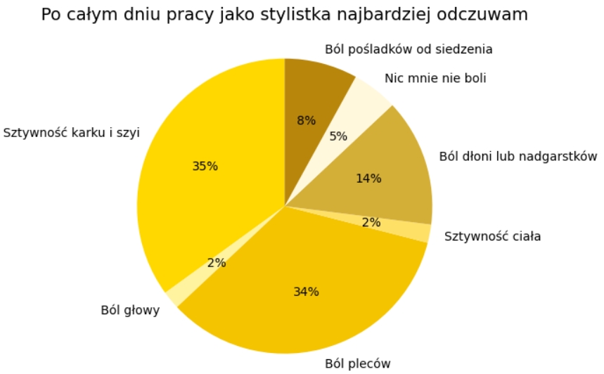 36% badanych zgłasza sztywność karku i szyi, 33% ból pleców, co wskazuje na przeciążenie odcinka szyjnego i lędźwiowego kręgosłupa. 14% stylistek doświadcza bólu nadgarstków i dłoni, typowego dla długotrwałej pracy manualnej w napięciu, natomiast 24% zgłasza ból pośladków związany z wielogodzinnym siedzeniem. Bóle głowy występują u 3% badanych, najczęściej jako konsekwencja przewlekłego napięcia mięśniowego. Przypomnę, że zaledwie 5% stylistek nie odczuwa żadnego dyskomfortu podczas pracy.